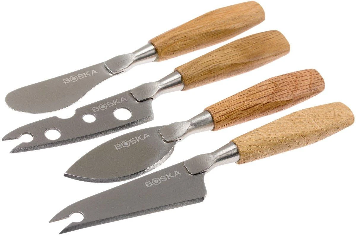 Este set de queso Boska mini oak contiene cuatro cuchillos para cortar y presentar el queso: un cuchillo de presentación, un cuchillo para untar, un cuchillo para parmesano y un cuchillo para quesos. El cuchillo adecuado para cualquier tipo de queso. Esto completará tu tabla de quesos.