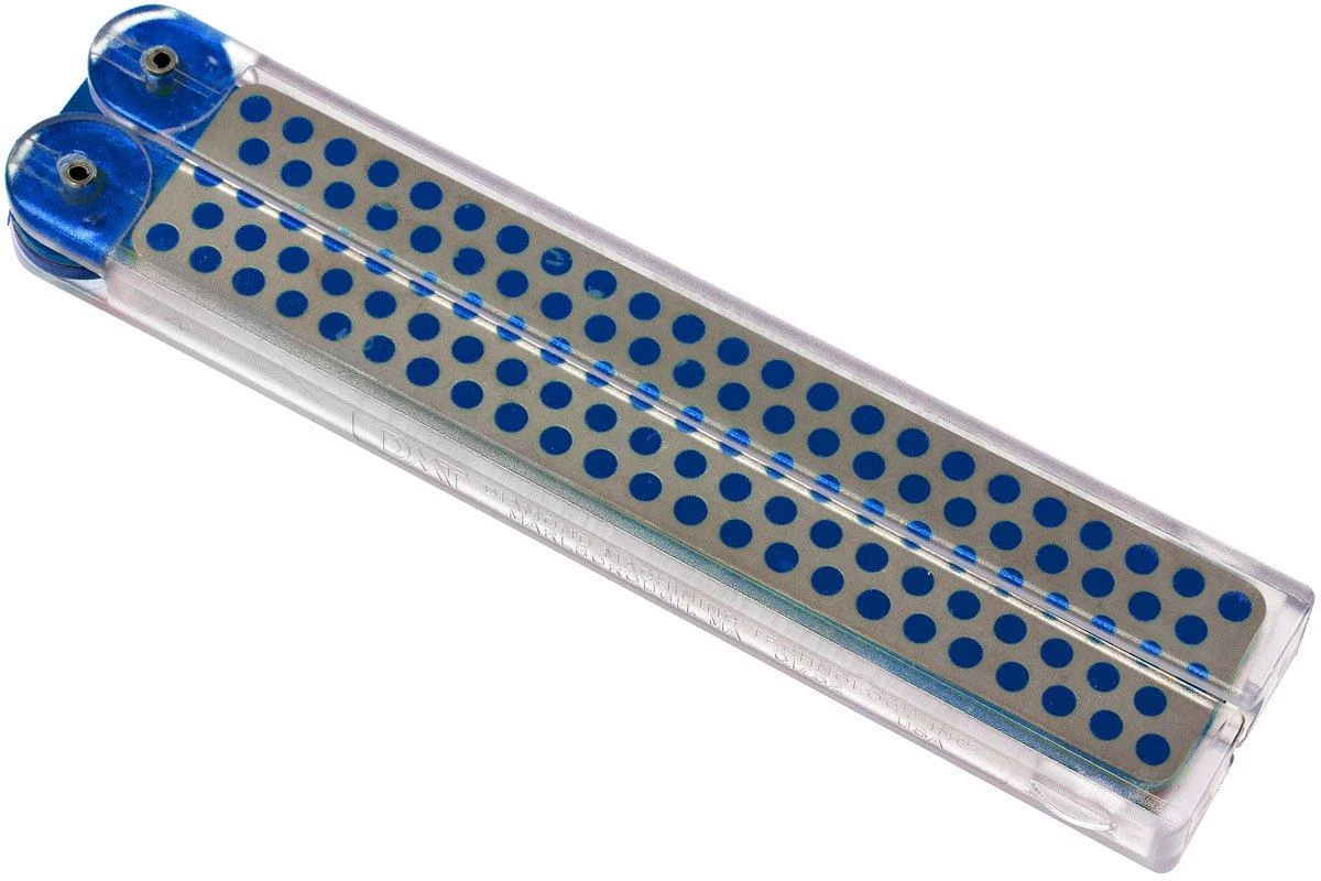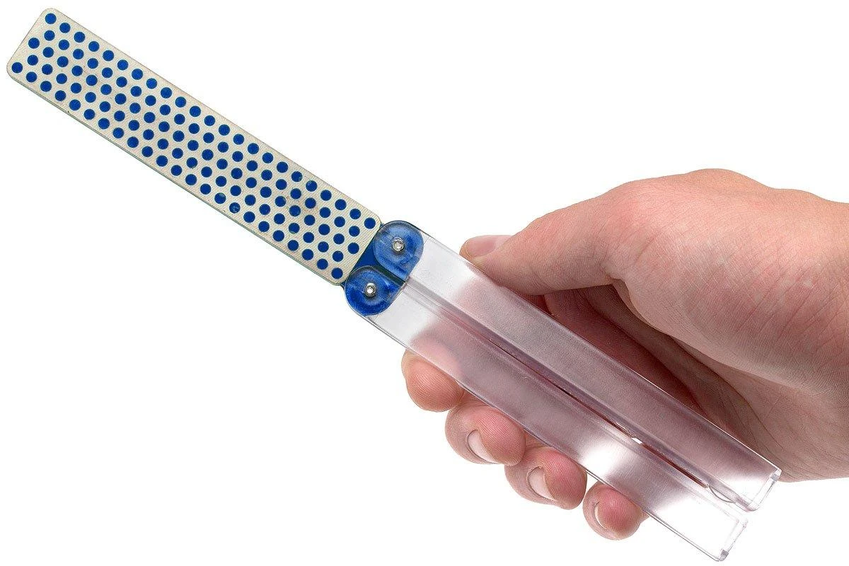 La piedra de afilar Diafold está diseñada como una navaja de mariposa en la que el mango se dobla alrededor de la piedra de afilar recubierta de diamante. Por ello, las piedras están siempre protegidas. Puedes usar un lado de la piedra. El color en el famoso patrón redondo de DMT te indica de qué tamaño de grano se trata.