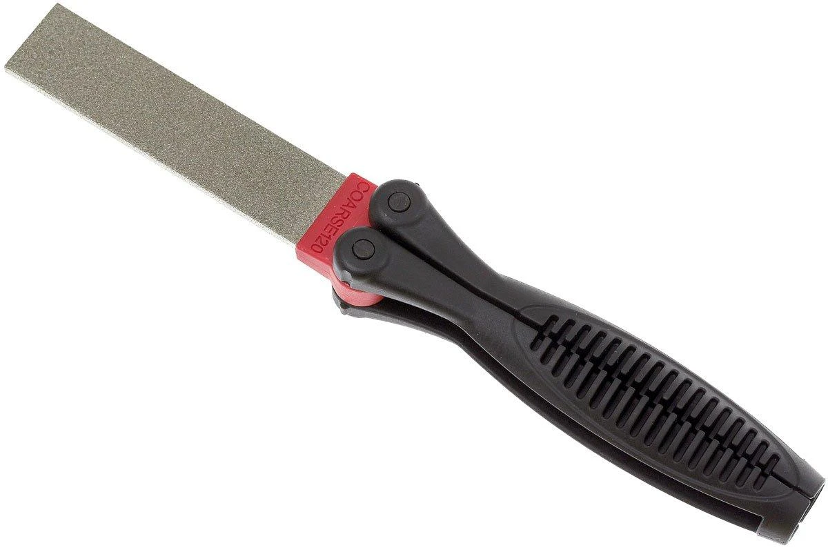 Esta piedra de afilar de doble cara es fácil de transportar porque el mango se pliega alrededor de la piedra. Es bastante compacta, por lo que la superficie de afilado está bien protegida cuando no se utiliza la piedra de afilar. El mango tiene forma ergonómica y se adapta cómodamente a la mano. La parte posterior del mango encaja muy bien cuando los mangos se tocan. Esto hace que el mango sea muy sólido y no se sienta como dos partes separadas. Esto parece un pequeño detalle, pero aumenta enormemente la comodidad del afilado.