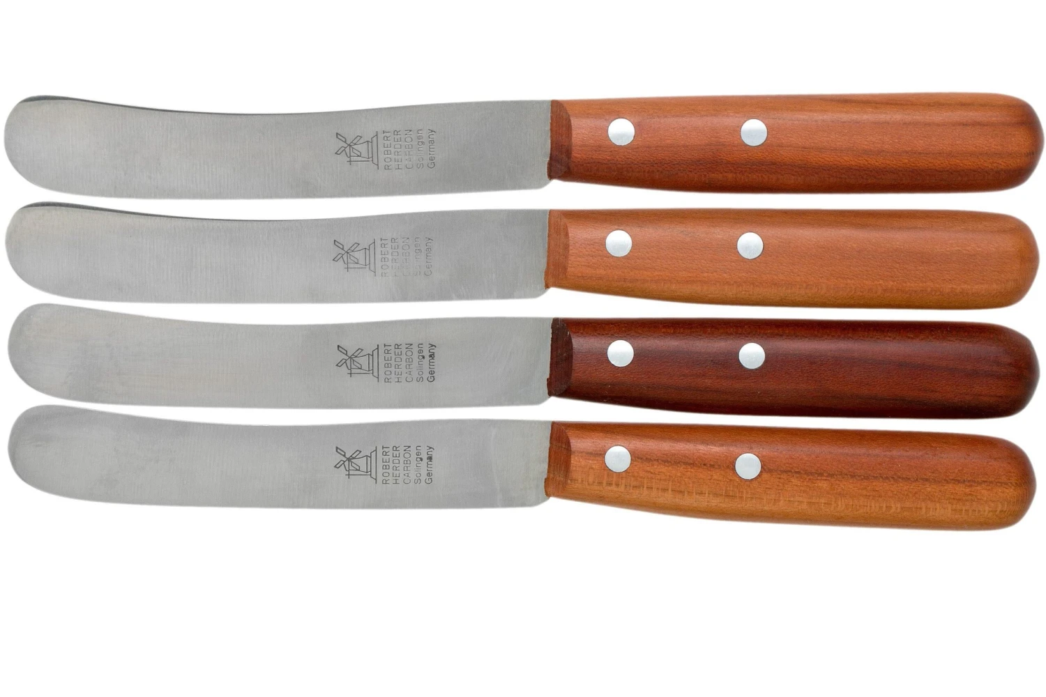 El Juego de 4 cuchillos de desayuno Robert Herder, madera de ciruela, carbón es un juego de cuatro característicos cuchillos de desayuno alemanes con la llamada forma «Buckels» y con mangos de madera de ciruela. Al igual que los otros cuchillos Robert Herder, la fina hoja de estos cuchillos está muy afilada. Por su afilado y la forma de la hoja, estos cuchillos son perfectos para cortar pan, bollos duros, queso, salami o para untar mantequilla en un trozo de pan.