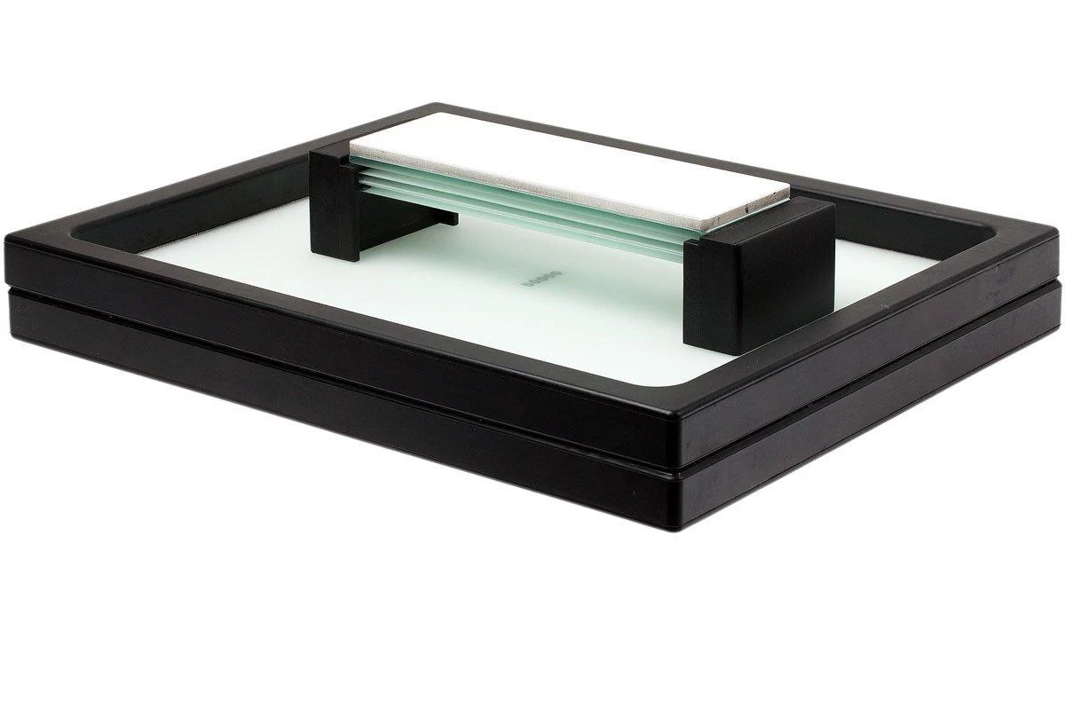 Todos los que afilan sus cuchillos en piedras de agua reconocerán este sentimiento: cuando termines de afilar tu cuchillo toda tu estación de trabajo estará mojada. ¡Esta Shapton Sharpening Pond es la solución! Es una superficie con un borde de goma que recogerá toda el agua de afilado. De este modo, no convertirás tu puesto de trabajo en una piscina y, al mismo tiempo, siempre tendrás agua alrededor para humedecer tu piedra. Sin embargo, para utilizar esta Sharpening Pond necesitarás un soporte de piedra de afilar. Esto servirá de base para el soporte.