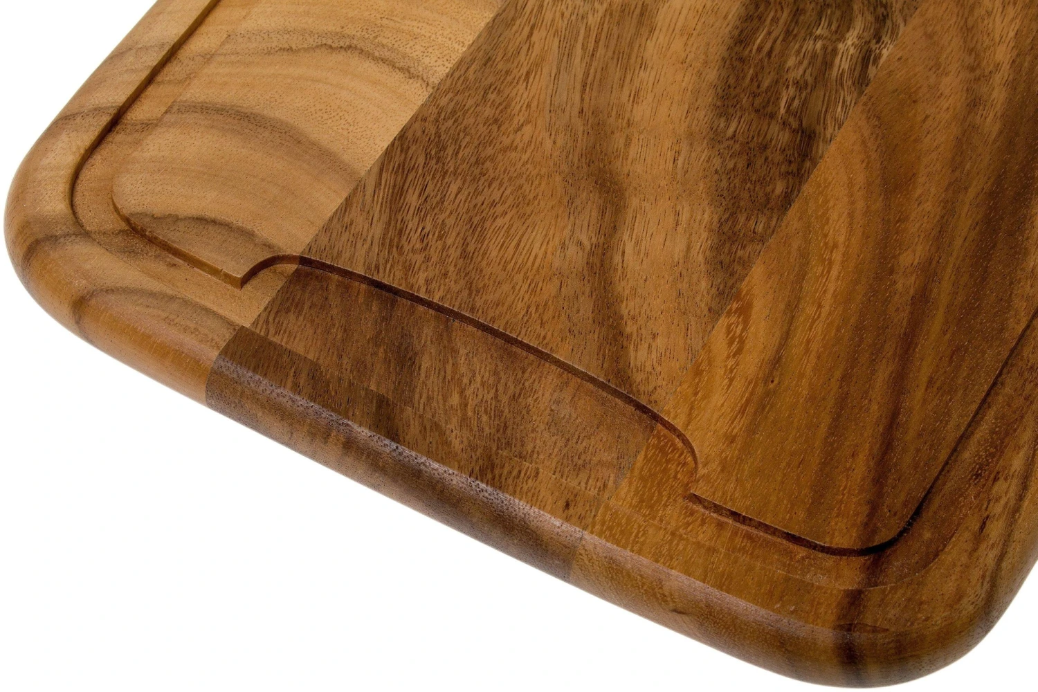 Esta tabla de cortar de madera de acacia de Zassenhaus es práctica de usar. Puedes utilizar ambos lados de esta tabla de cortar porque no tiene patas. Un lado está mejorado con un hueco para recoger la humedad y las migas. El otro lado es completamente liso.